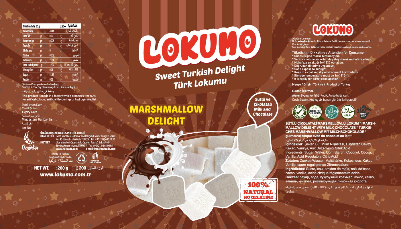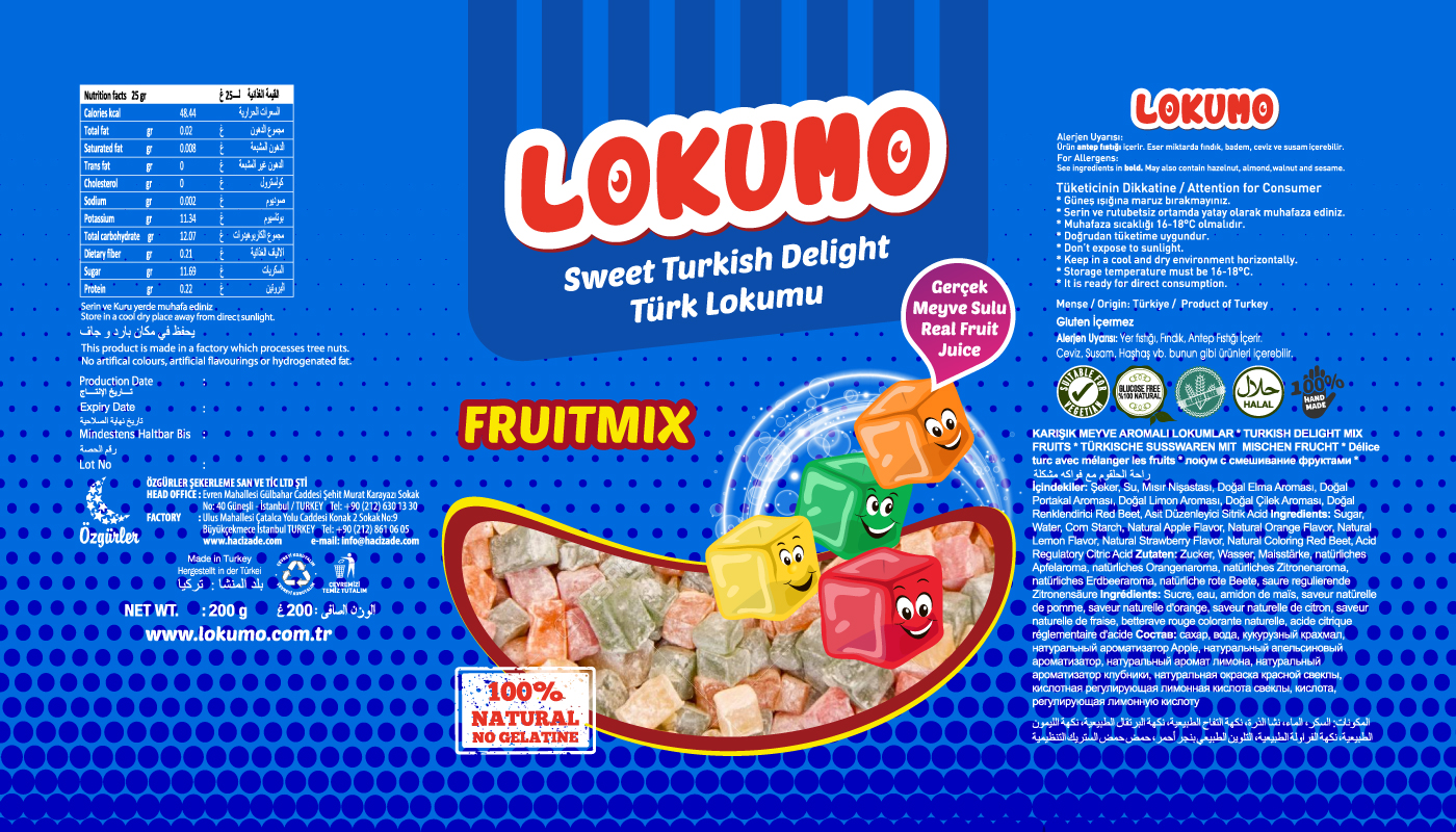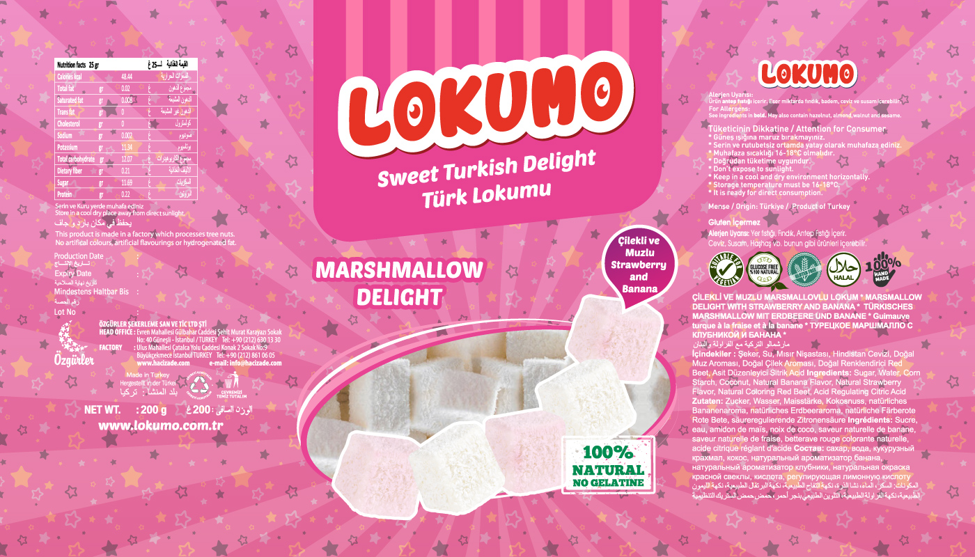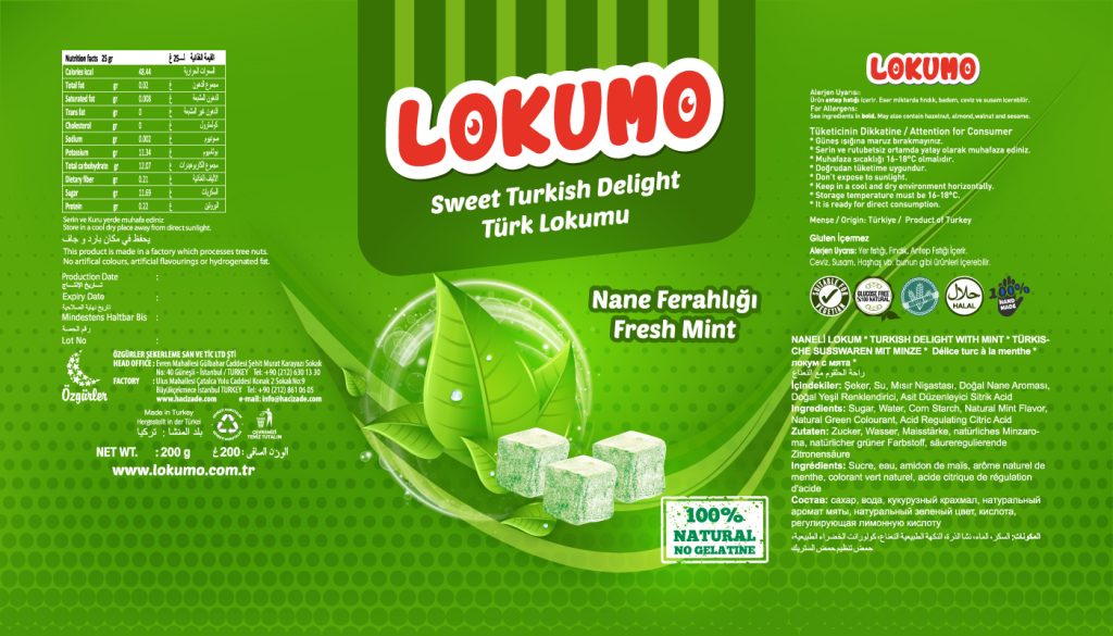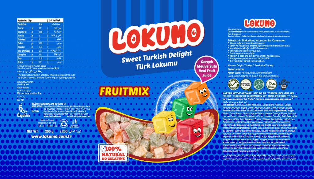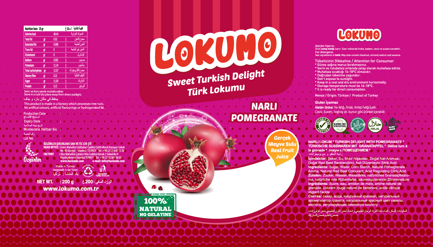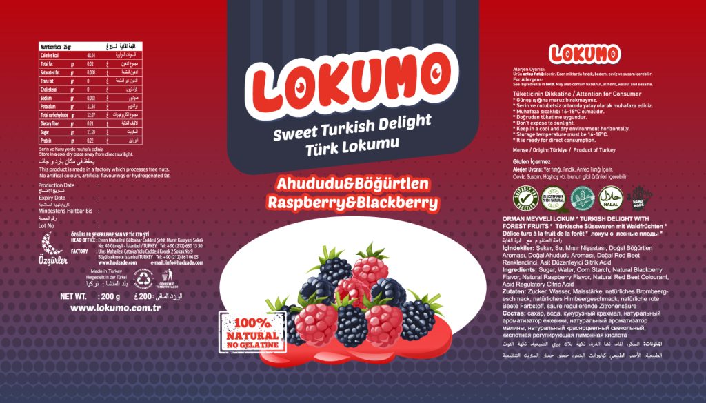 Lokumo markası için çeşitli aromalardaki lezzetli lokumlarının poşet ambalaj tasarımlarını sağladık.